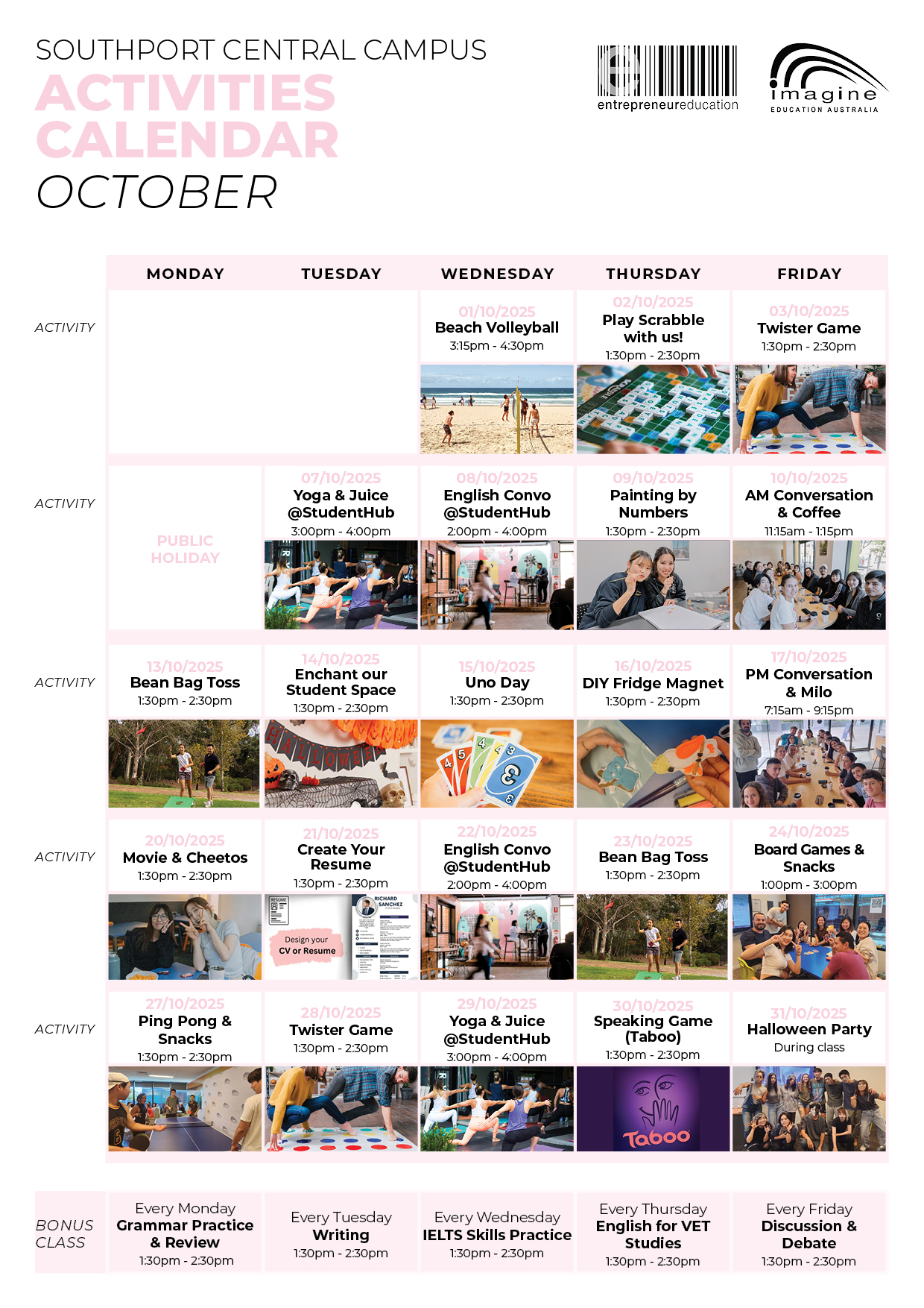 We love having fun on campus and seeing students enjoying their time here, so what better way to do that than with fun activities, excursions and events. We also never need an excuse to eat pizza with regular pizza lunches throughout the year for all students! Some of the activities to expect are:
